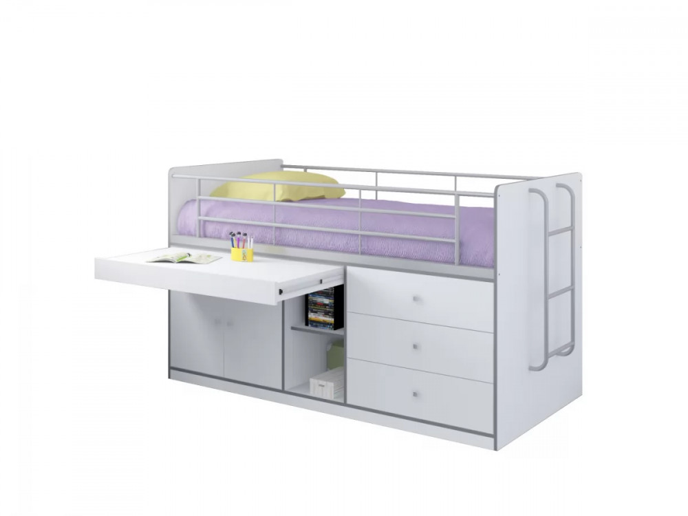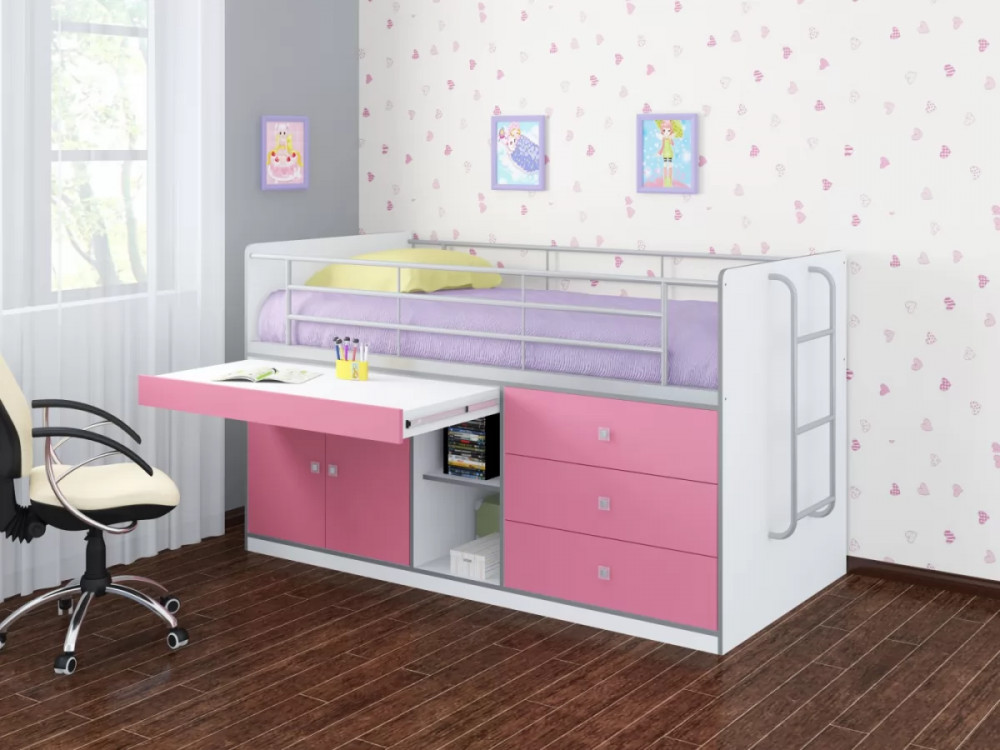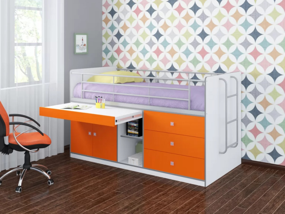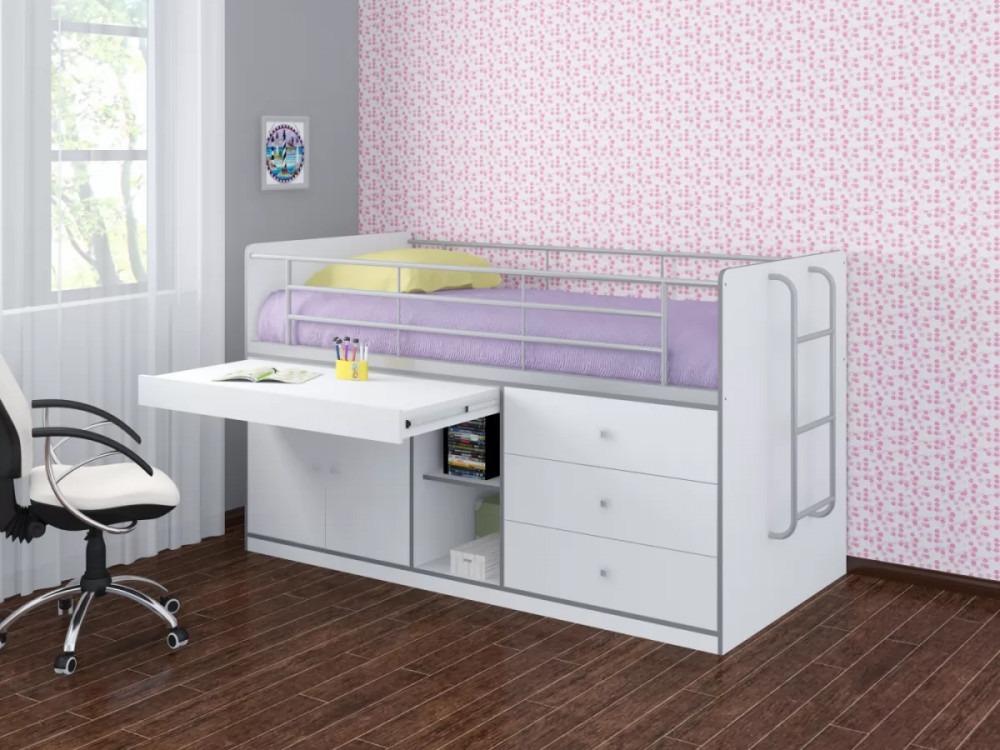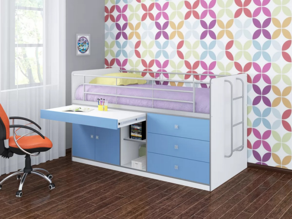 Кровать оборудована металлической лестницей. Прочная конструкция рассчитана на детей от 1 до 18 лет. Такой комплекс экономит пространство и полностью обеспечивает выполнение всех многообразных функций детской и подростковой комнаты.