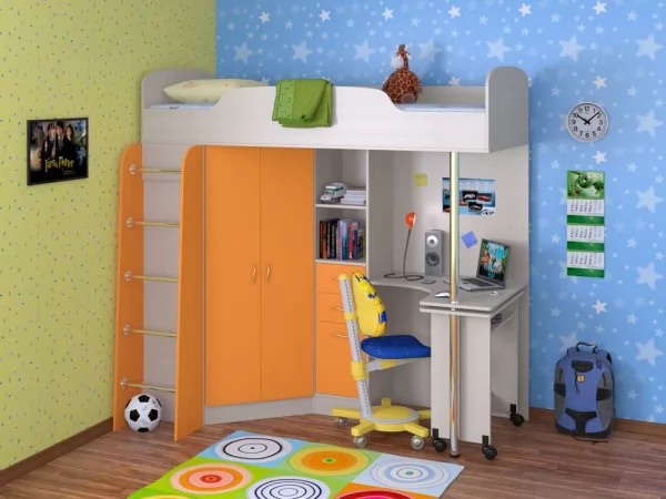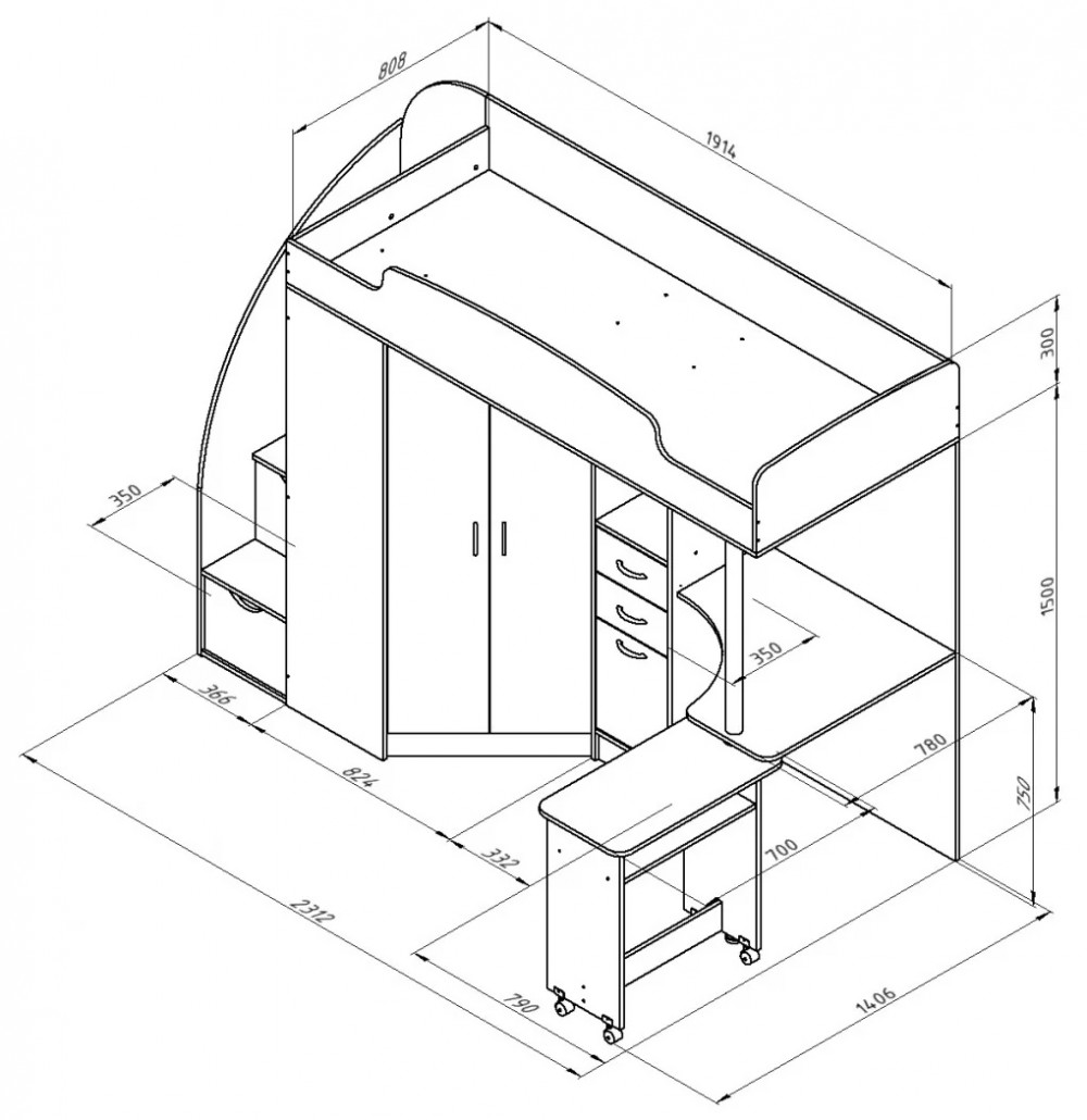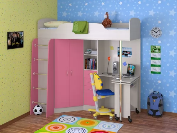 Кровать-чердак "Теремок-1" - это целый комплекс мебели, включающий в себя спальное место размером 190*80 см, шкаф для одежды, пенал с ящиками и полноценный рабочий стол. Прочная конструкция рассчитана на детей от 3 до 16 лет. Такой уголок экономит пространство в детской комнате, при этом обеспечивая все необходимые функции.