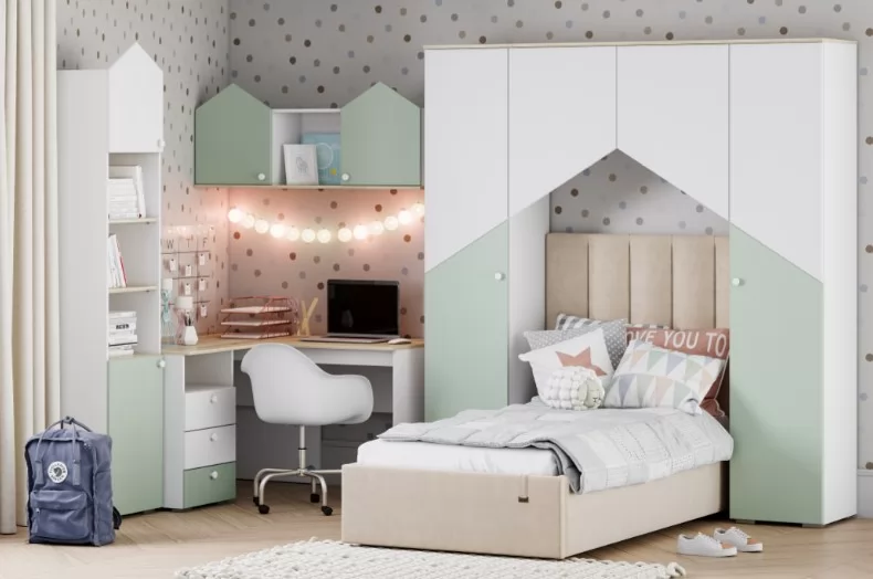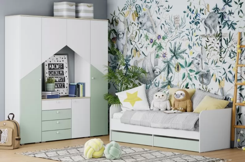 Шкаф для белья НМ 041.43 Банни не займет много места в детской комнате. Компактная, но очень вместительная модель шкафа с пятью полками, позволит разместить вещи и игрушки. Особенности стиля детской «Банни» - это: светлые, спокойные оттенки в единой гамме. Скругленные ручки-кнопки не имеют острых граней. Ящики для хранения белья позволят навести порядок в комнате и расположить вещи. Скандинавская стилистика не любит загромождения мебелью. Только функциональность и практичность. Если правильно спланировать интерьер, в детской будет много места для хранения и пространства для игр. Фасады выполнены из МДФ с покрытием пленкой ПВХ.