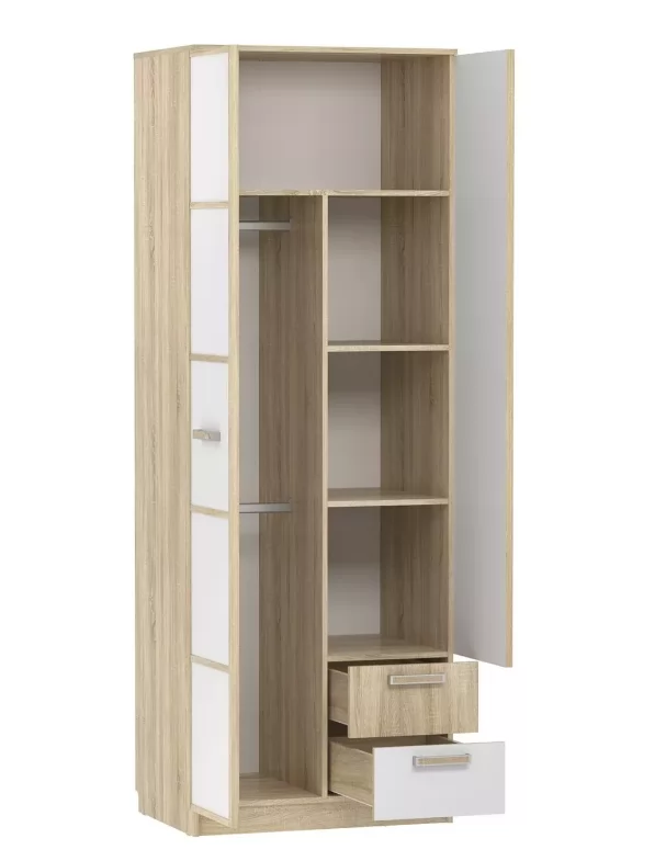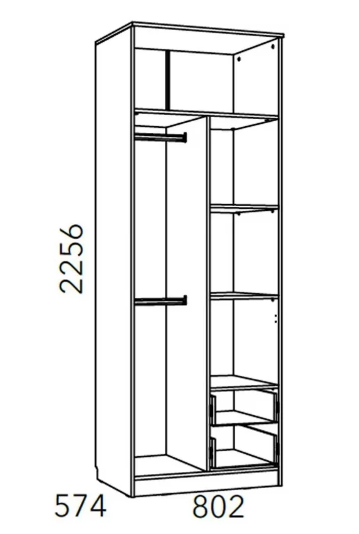Ширина (мм): 802 Высота (мм): 2256 Глубина (мм): 574 Цвет: Белый/Дуб сонома Материал: ЛДСП/МДФ Вес, кг: 92.7 Объем, м3: 0.213 Количество упаковок: 3 Гарантия: 24 месяца Коллекция: Фанк Петли: Накладная 90 Ручка: С-31, ручка-скоба пластик Наличие ящиков: Есть Количество дверей: Двухдверный