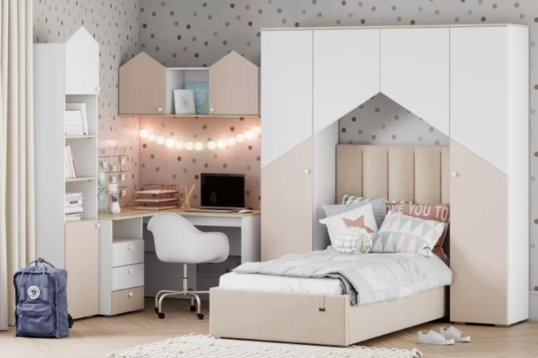 Особенности стиля детской «Банни» - это:  светлые, спокойные оттенки в единой гамме. Скругленные ручки-кнопки  не имеют острых граней. Ящики для хранения белья позволят навести порядок в комнате и расположить вещи. Скандинавская стилистика не любит загромождения мебелью. Только функциональность и практичность. Если правильно спланировать интерьер, в детской будет много места для хранения и пространства для игр. Фасады выполнены из МДФ с покрытием пленкой ПВХ.