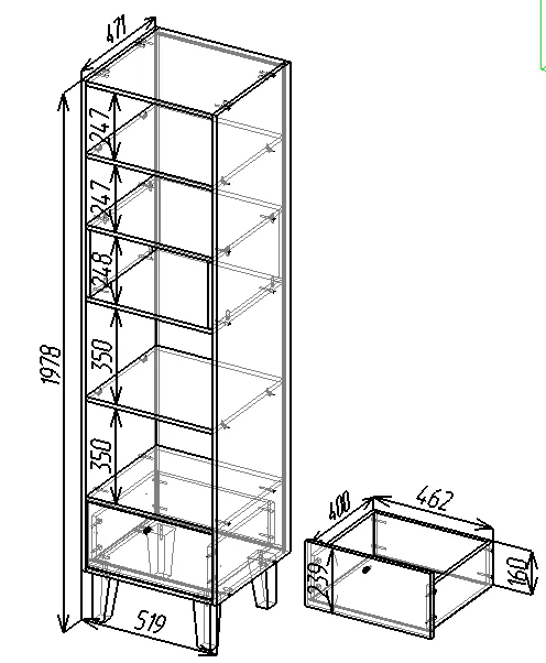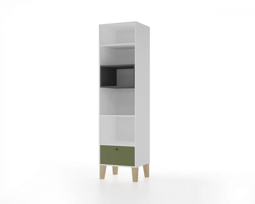 Ширина (мм): 519 Высота (мм): 1978 Глубина(мм): 471 Цвет корпуса: Белый / вставка полка Темно-серый Цвет фасада / вставок: Олива Цвет видимой фурнитуры: Черный Материал корпуса: ЛДСП Материал фасада / вставок: ЛДСП Вес (кг): 35