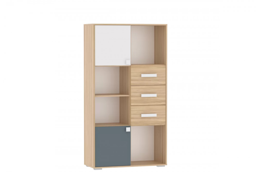 Стеллаж из новой коллекции детской мебели Элиот выполнен в нейтральных оттенках песочного, белого и контрастного маренго – цвета темной морской волны, что позволяет вписать стеллаж в интерьер спальни как девочки, так и мальчика, придав комнате современный и стильный вид. Стеллаж оснащен двумя полками с распашными дверками и тремя выдвижными ящиками, а открытые системы хранения позволяют расставить на видных местах сувениры, книги и украсить комнату так, как нравится ребенку. Для выдвижения ящиков используются шариковые направляющие, которые равномерно распределяют вес содержимого и обеспечивают плавный бесшумный ход ящика. Двери могут крепиться как на левую, так и на правую стенки. Стеллаж помогает поддерживать порядок и расширяет пространство для хранения вещей ребенка. Дополните стеллаж шкафом для одежды из одноименной серии, чтобы создать гармоничную атмосферу!