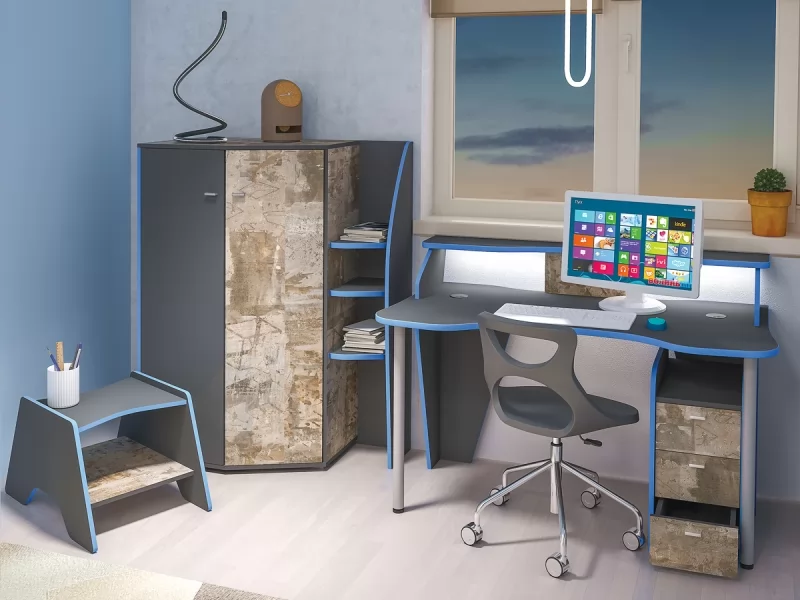 Компьютерный стол имеет поддержку для локтей, светодиодную подсветку и подготовлен для укладки проводов компьютера (в столешнице предусмотрены заглушки). Кровать имеет вместительную выкатную систему хранения, светодиодную подсветку, функциональные приспинные полки.