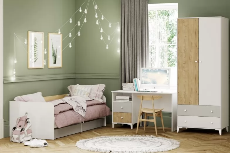 Скандинавская стилистика не любит загромождения мебелью. Только функциональность и практичность. Модульная композиция Комплектации 3 включает: шкаф, письменный стол и кровать с мягкой спинкой. Высокие опоры придают легкость конструкции и не создают препятствий для проведения влажной уборки. Чтобы процесс обучения приносил ребенку больше положительных эмоций, необходимо обустроить комфортное место для занятий дома. Письменный стол поможет комфортно и удобно делать домашнее задание, выполнять различные работы. Если правильно спланировать интерьер, в детской будет много места для хранения и пространства для игр.
