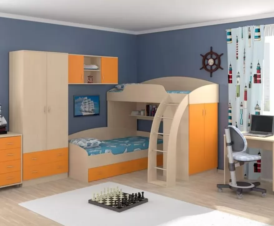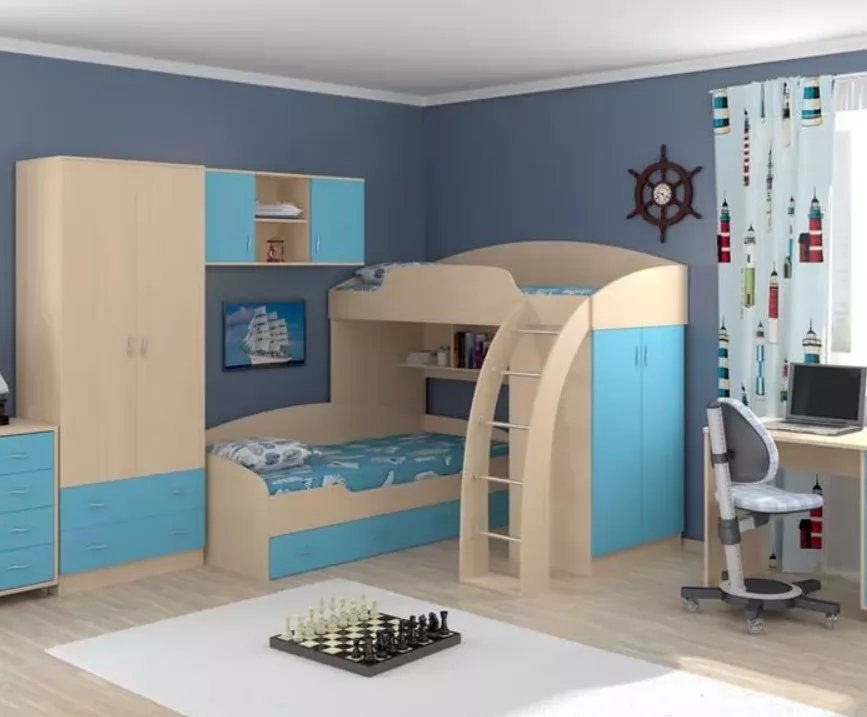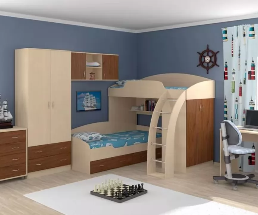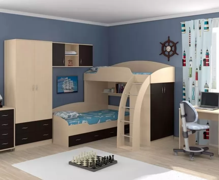 Корпус модулей выполнен из ЛДСП Egger, кромка - ПВХ 2 мм и 0,4 мм. Фурнитура производства России, Турции, Германии. Сборка верхней кровати возможна в любую сторону.