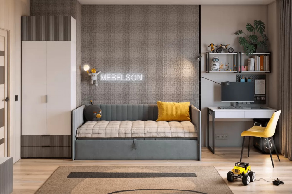 В состав комплекта входят следующие модули: Зефир Шкаф двухдверный 120.01 - 1 шт. Зефир Антресоль двухдверная 118.01 - 1 шт. Стол Юниор - 1 шт. Полка Юниор - 2 шт. Кровать с подъемным механизмом Твикс (Софа) 90х200 см - 1 шт.