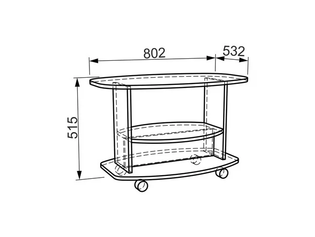 Состоит из: стола на колесных опорах, полки. Изделие симметричное.