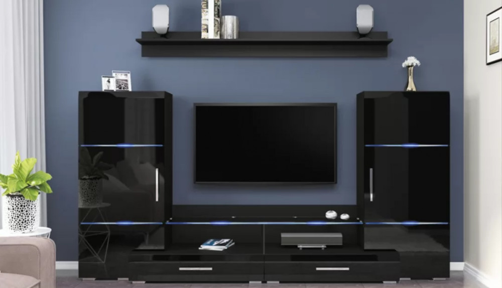 Шикарная глянцевая гостиная состоит из тумбы ТВ с двумя выдвижными ящиками, двух шкафов и навесной полки. Идеально подойдет для небольшой комнаты в современном стиле.