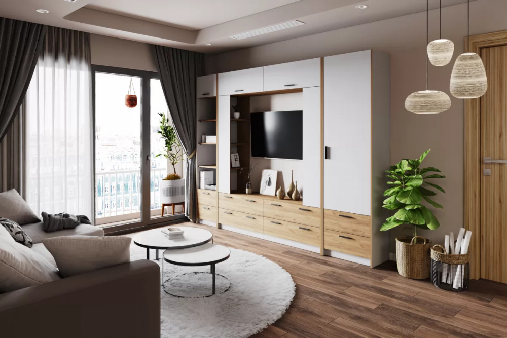 Изюминкой является функциональная стенка. Как правило, такая мебель не украшена крупным броским декором, зато имеет максимальное количество полочек и ящиков и сохраняет свободное пространство до последнего сантиметра. Шкафчики в верхней части стенки оснащены удобными дверками, с открытием вверх. Скрытые полки за распашными дверками в средней части изделия придутся по вкусу любителям книг и интерьерных мелочей. Нижнюю часть стенки занимают четыре вместительных выдвижных ящика на шариковых направляющих, позволяющие аккуратно разместить вещи.