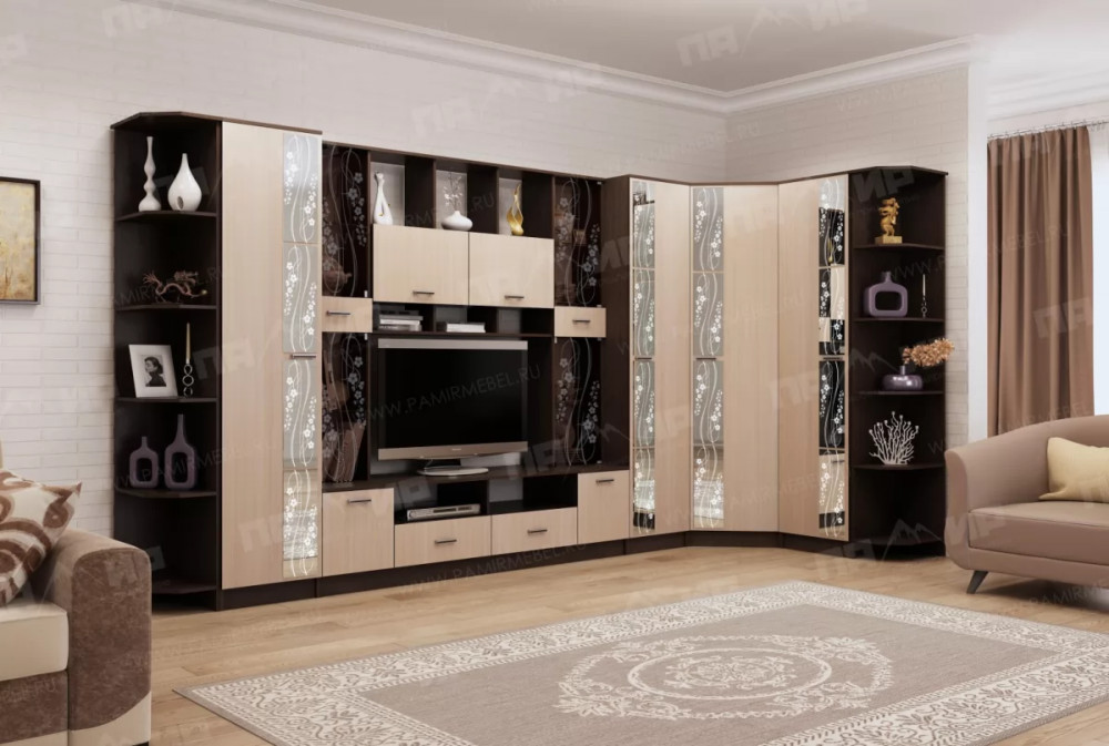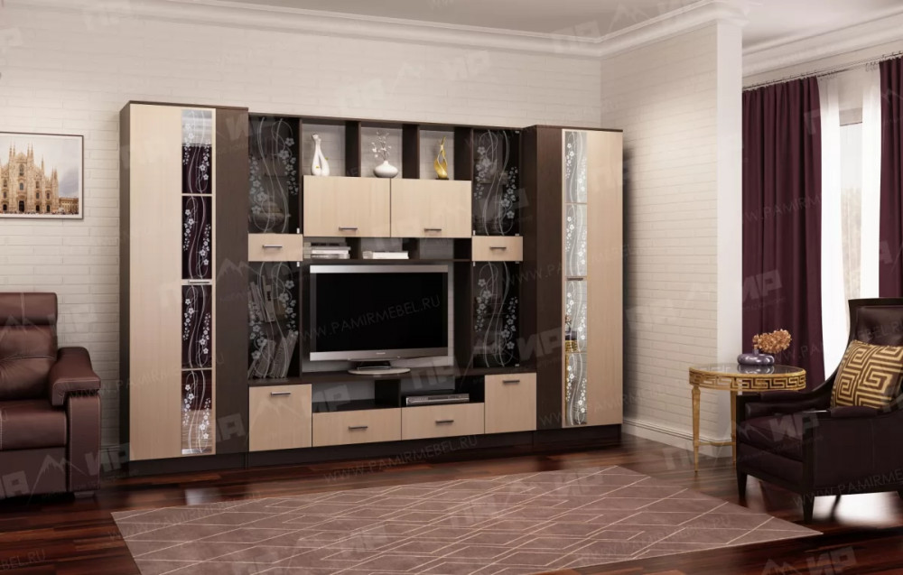 Модульная система для гостиной "Сабина" - это классическая модульная программа, имеющая в своем составе 5 модулей. В гостиной «Сабина» применяются современные европейские декоры: корпус выполнен из ЛДСП «Дуб венге цаво», фасад из ЛДСП «Дуб белфорт». Декоры отличаются выраженной древесной текстурой, а фасадная часть украшена тонированным стеклом и зеркалами с пескоструйным рисунком. Мебель изготавливается из ЛДСП.