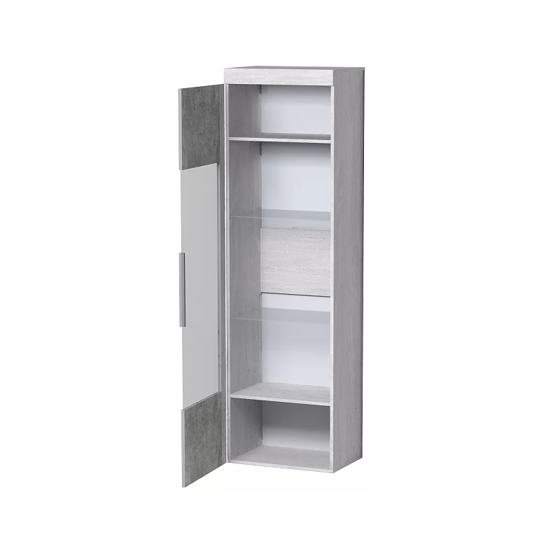 Посудный шкаф со стеклянной дверцей позволит выставить в гостиной те коллекционные и памятные вещицы, которыми вы дорожите. Стеклополки в обработке еврокромкой выдерживают до 10 кг каждая. Фасад перенавешивается на левую и правую сторону. Серебристая стильная ручка из массива дерева и серое тонирование стекло фасада вносят смелые дизайнерские штрихи в восприятии актуальноого декора "под бетон".