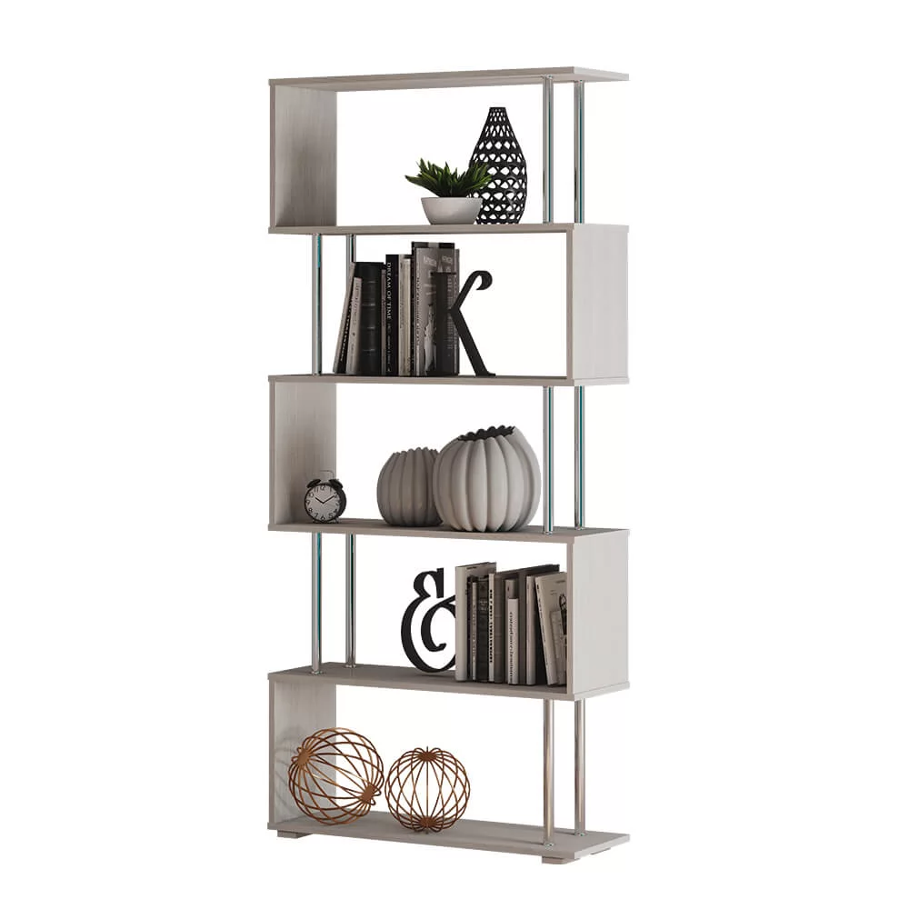 - невесомости основным полкам стеллажа, выполненным в светлом цвете лоредо, придают хромированные штанги.