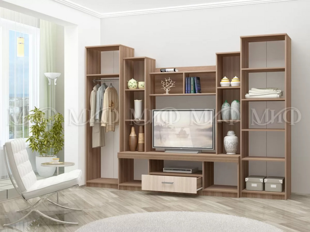 Стенка в гостиную из дуба. Настоящее украшение модели – центральные шкафы-витрины с нанесенным на стекло фантазийным рисунком. Красивая гостиная для стильного интерьера и практичного выбора.
