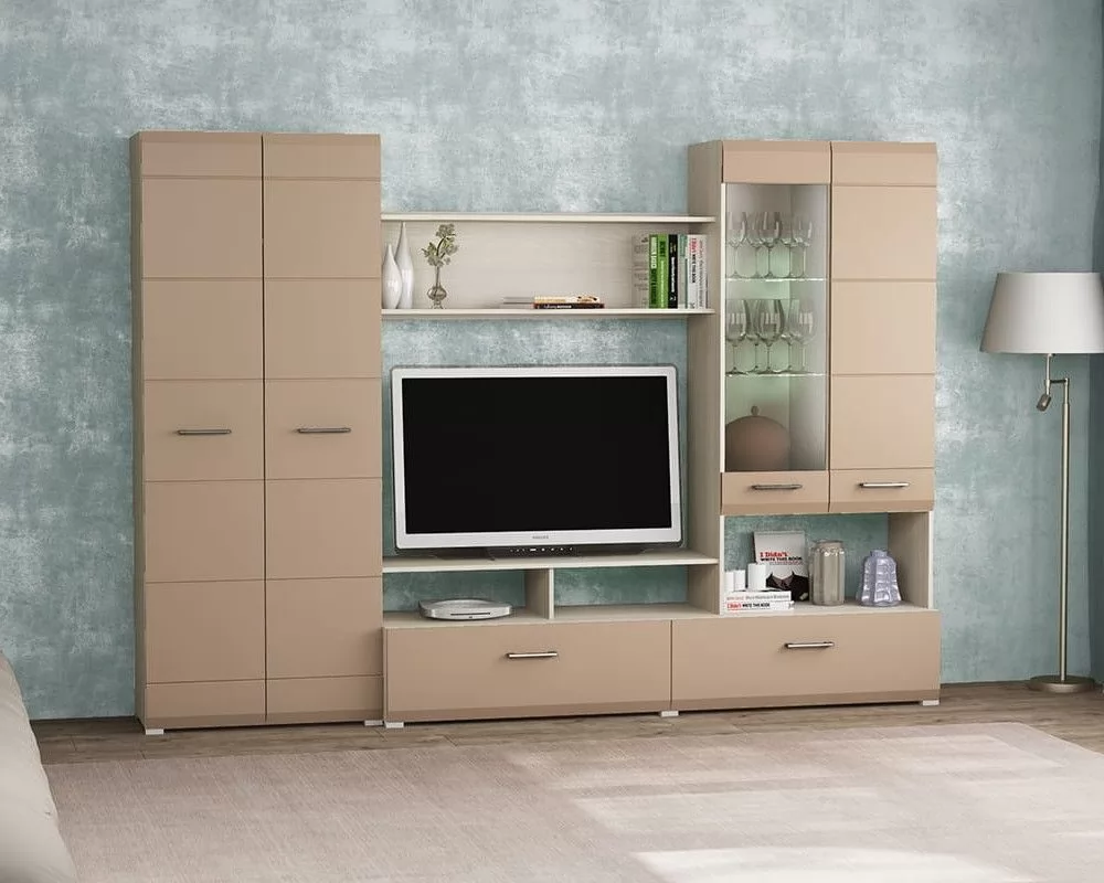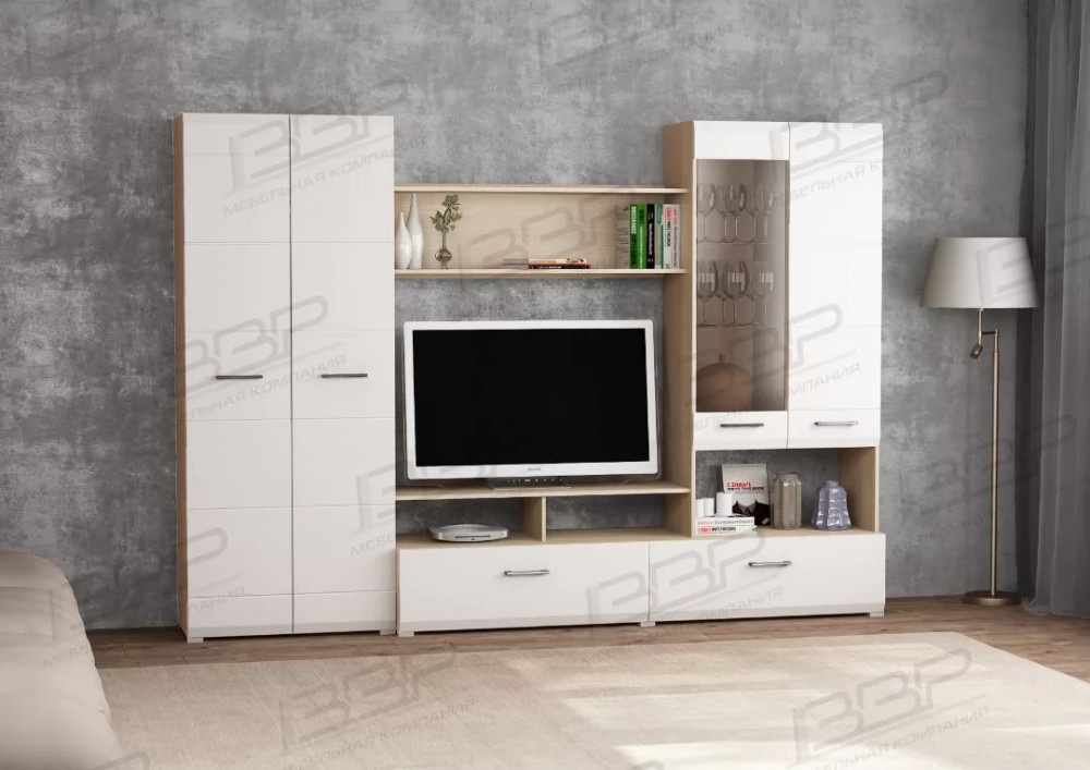 Гостиная "Дублин" это компактная гарнитур для гостиной в светлых тонах. Гостиная Дублин 3 имеет удобный шкаф для одежды, шкаф для посуды и небольших предметов. В верхней части гостиной расположена полка для ваз или книг. В центральной части предусмотрена ниша под ТВ. Ее размер составляет 120 х 86 см. Гостиная изготавливается в цветах ясень шимо светлый / белый глянец. Корпус гостиной изготавливается из ДСП, а фасады из МДФ с глянцевым покрытием.
