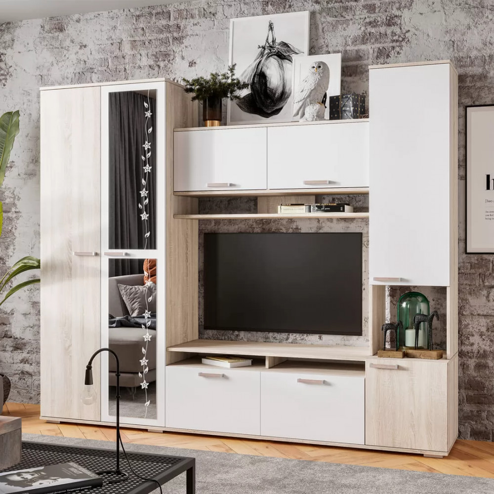 Контрастное сочетание фасадов белого цвета с древесной фактурой дуб сонома, а также отделка зеркалами станут ярким акцентом любого интерьера.