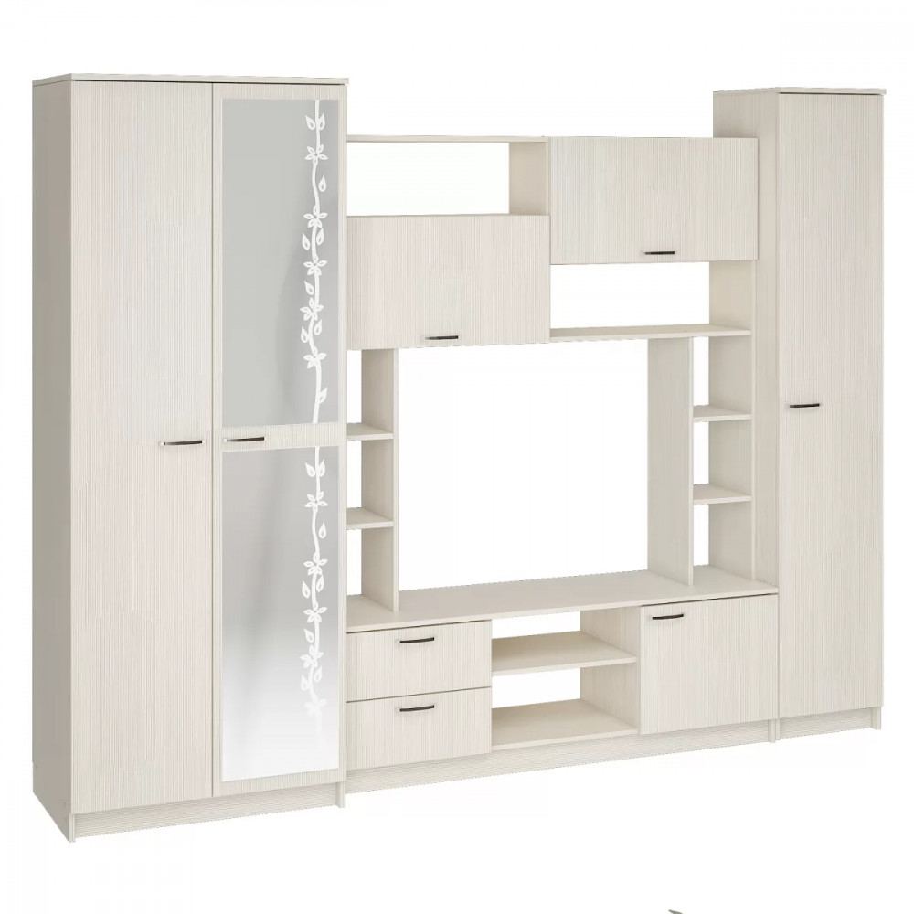 Многофункциональная и практичная гостиная выполнена в современном дизайне - Гостиная состоит из трёх модулей (шкаф платяной, шкаф бельевой, средняя секция), которые при желании можно устанавливать отдельно друг от друга, размещая в разных комнатах - Размер средней секции (ШхВхГ): 1500х1940х420 мм - Ниша под ТВ: 1000х800 мм, для моделей телевизоров с диагональю до 43" - Размеры платяного шкафа (ШхВхГ): 800х2100х530 мм - Платяной шкаф комплектуется горизонтальной штангой - Размеры пенала (ШхВхГ): 400х2100х430 мм - Зеркало 4 мм, с пескоструйной обработкой - Ручка пластик - Сборка универсальная, собирается как на левую, так и на правую сторону -Фасад можно перенавесить как на правую, так и на левую сторону