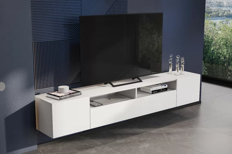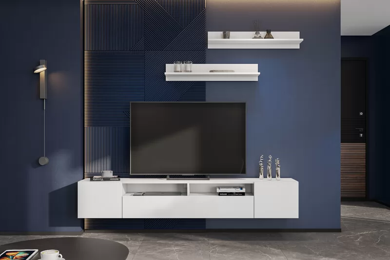 Тумба под ТВ «Денвер» может устанавливаться как на пол, так и крепиться к стене, чтобы использовать её в качестве навесной тумбы — для этого не нужно устанавливать заднюю стенку и устанавливать опоры. Максимальная нагрузка на тумбу в навесном состоянии — 30 кг.