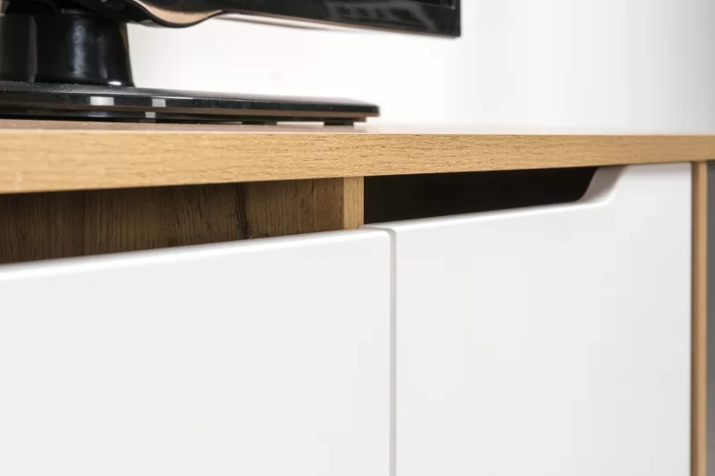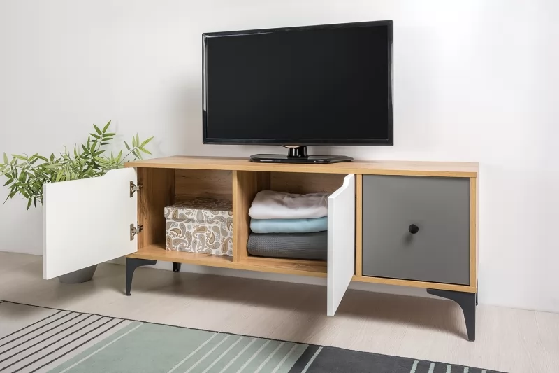 Тумба Вайс гармонично сочетает в себе строгий и брутальный декор крафтового дуба со спокойными скандинавскими фасадами.