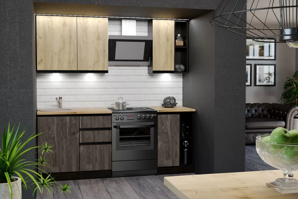 Прямые готовые кухни рациональны для маленьких квартир. Их стоимость ниже угловых на 10-15 процентов, при этом все ящики и шкафы находятся в удобном доступе. При прямой планировке кухни важно предусмотреть место для холодильника и учесть его габариты. Если ваша кухня объединена с гостиной, или же настолько просторная, что позволяет сделать полноценную обеденную зону для большой семьи, то смело выбирайте линейную конфигурацию кухни.