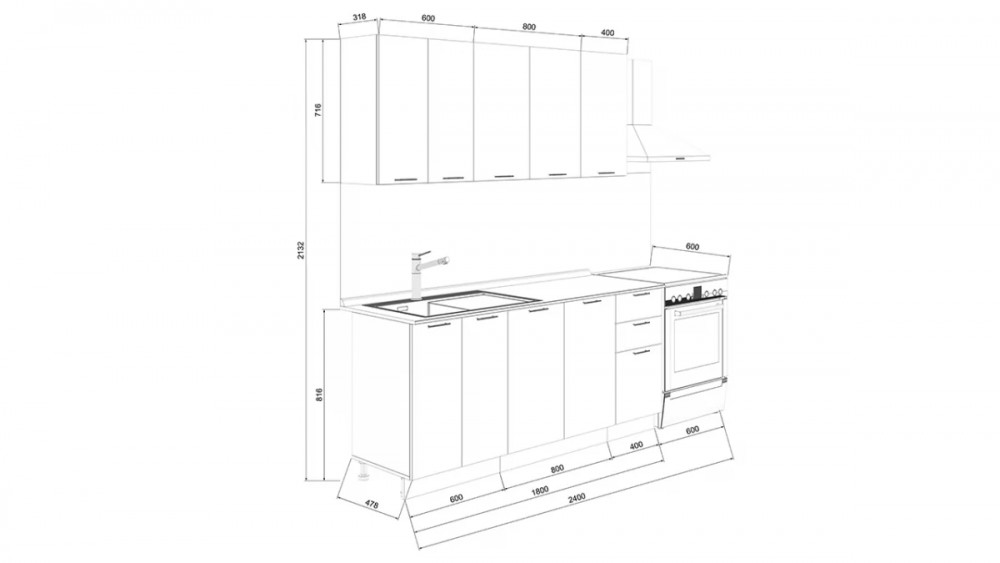 Габаритный размер готового набора модулей с учетом газовой плиты на 60 см: 2 400