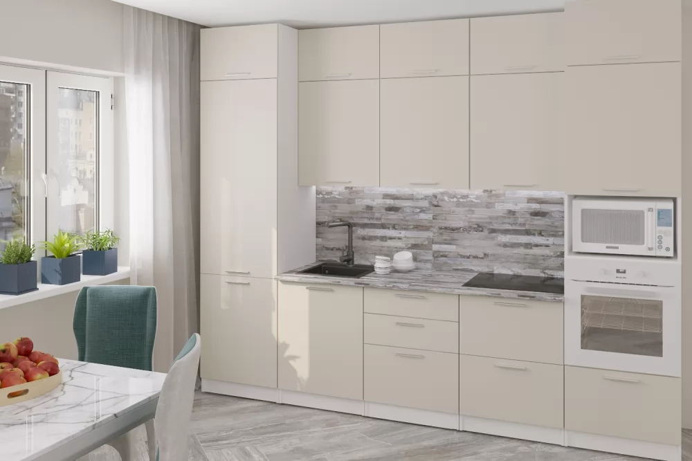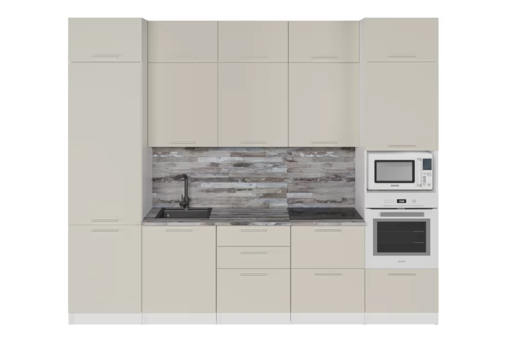 Мойки, смесители, посудосушители, варочные панели, духовые шкафы, плиты, вытяжки в комплекты гарнитуров не входят.