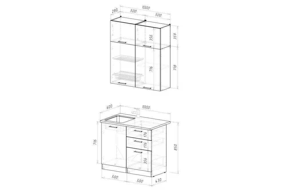 Мойки, смесители, посудосушители, варочные панели, духовые шкафы, плиты, вытяжки в комплекты гарнитуров не входят.
