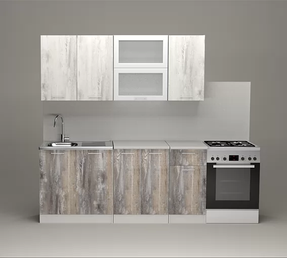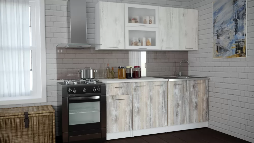 Ширина, мм-1800 Глубина, мм-600 Высота столов, мм-850 Высота шкафов, мм-720 Материал-ЛДСП Цвет короба-Белый Цвет верхних фасадов-Пайн белый Цвет нижних фасадов-Пайн экзотик Цвет столешницы-Сахара Рамка-Белый Стекло-Матовое Ручка-Рейлинг Количество упаковок, шт.-8 Гарантия-24 месяца