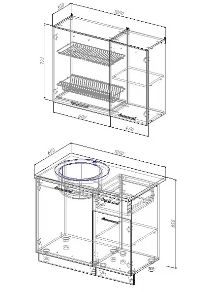 - Фасады верхних модулей со свесом – дают возможность использовать модули без установки ручек, а также установить скрытую подсветку;