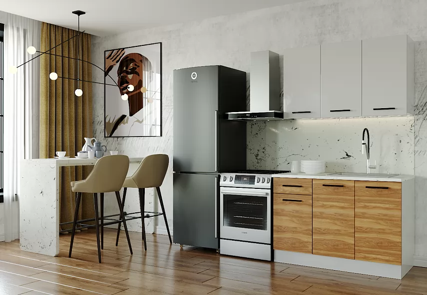 - Столешницы цельные со скруглением по переднему краю, пластиковым покрытием и силиконовый каплесборник (защищает фасады нижних модулей от попадания влаги и разбухания);