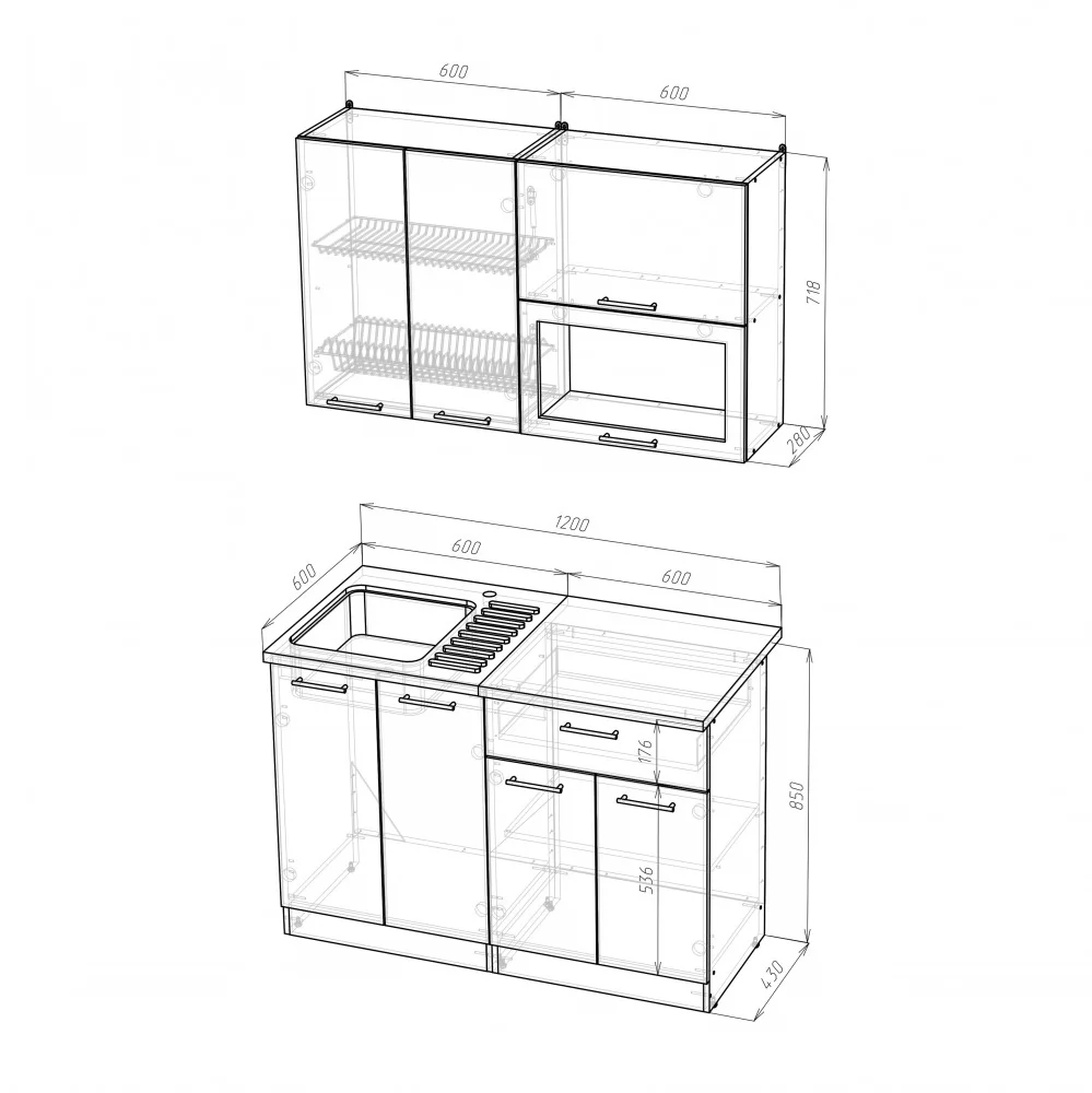 Мойки, смесители и посудосушители в комплекты гарнитуров не входят.