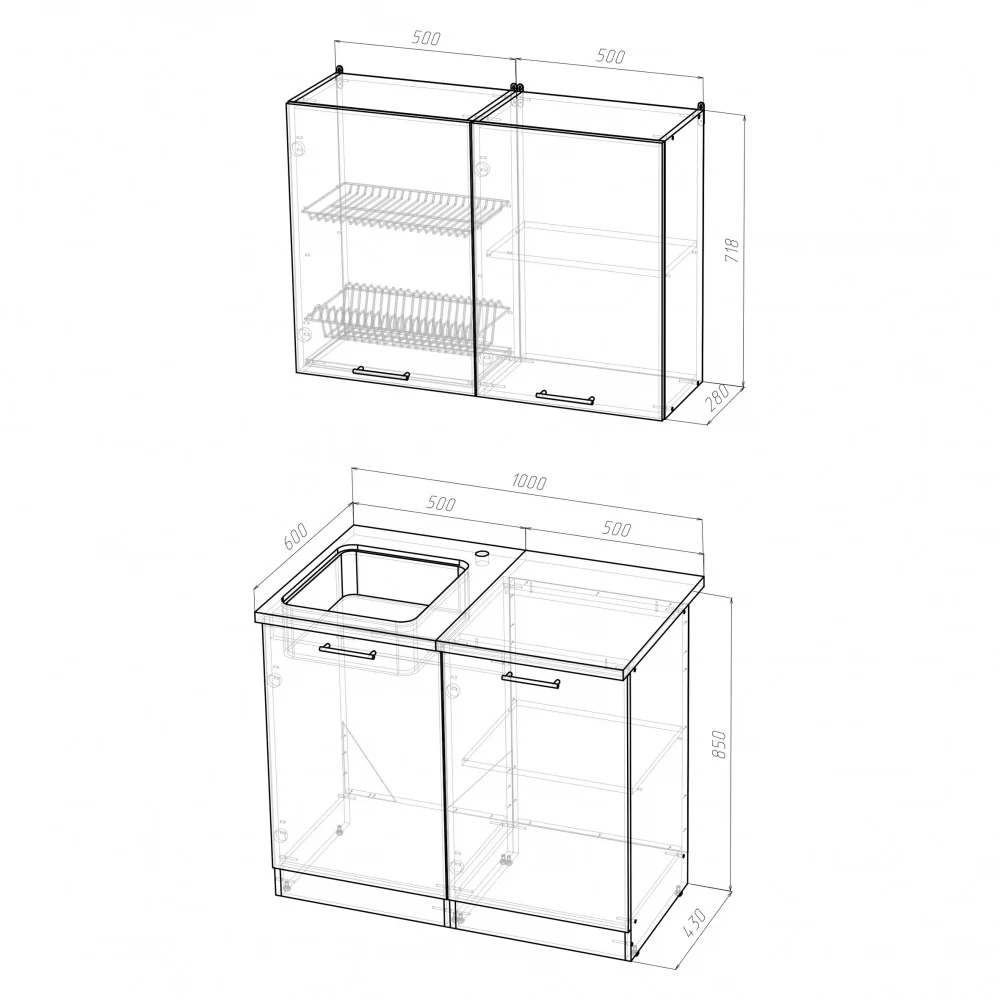 Мойки, смесители и посудосушители в комплекты гарнитуров не входят.