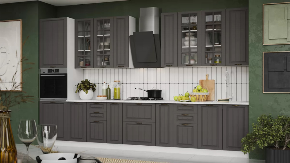 Назначение: Мебель для хранения Гарантийный срок: 24 месяца Возможность установки бытовой техники: Да Комната использования: Кухня Материал кромки каркаса: ПВХ Цвет ручки: Брашированная старинная бронза Стиль: Классический Габаритная длина: 3 800 Стекло: Да Тип: Кухонный гарнитур Расположение: Напольный, навесной Тип направляющих ящиков: Шариковые Материал ножек/опоры: Пластик Наполнение: Полки ЛДСП, Ящики Материал каркаса: ЛДСП Столешница в комплекте: Нет Направление открытия двери: Определяется при сборке Материал ручек: Металл Производство: Россия Габаритная высота: 2 132 Форма предмета: Прямой Возможность установки мойки: Да Модель: Лина Возможность установки сушки: Да Срок службы: 5 лет Материал фасада: МДФ, пленка ПВХ, стекло Оттенок: Белый, Серый Цвет: Белый, Графит Цвет каркаса: Белый Цвет фасада: Графит Оттенок каркаса: Белый Оттенок фасада: Серый Тип сборки: Универсальный левый/правый Цвет стекла: Сатин В стоимость не включено: Стеновая панель, столешница, доводчики, бытовая техника, мойка, смеситель, аксессуары Наличие механизма раскладки: Нет Наличие спального места: Нет
