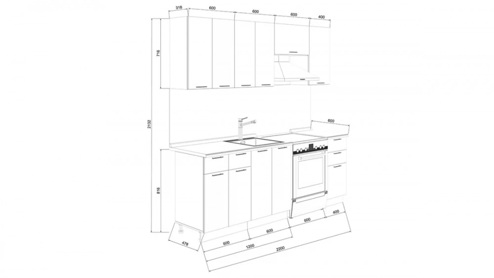 Габаритный размер готового набора модулей с учетом газовой плиты на 60 см: 2 200