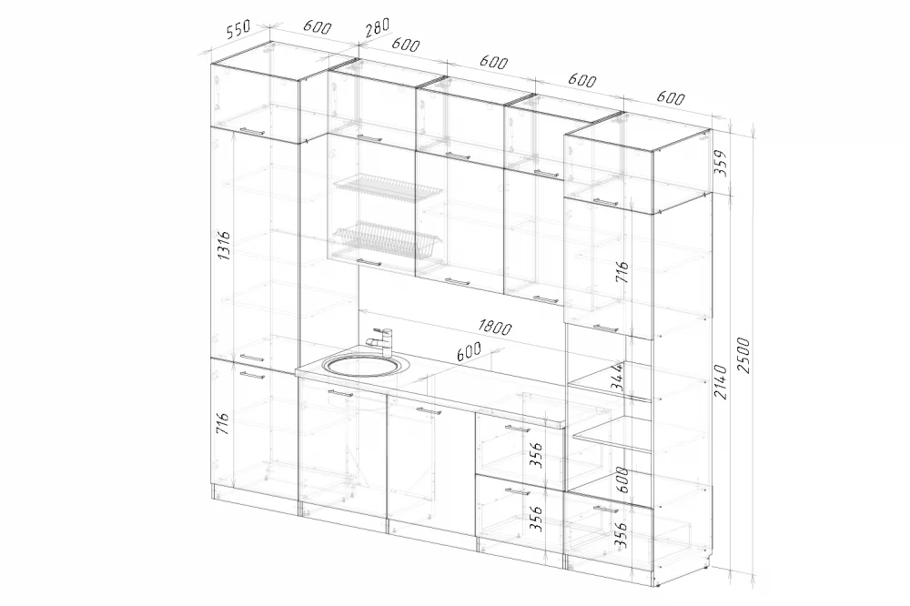 Мойки, смесители, посудосушители, варочные панели, духовые шкафы, плиты, вытяжки в комплекты гарнитуров не входят.