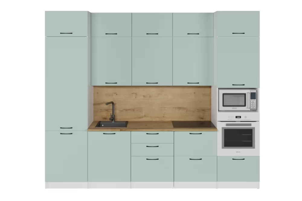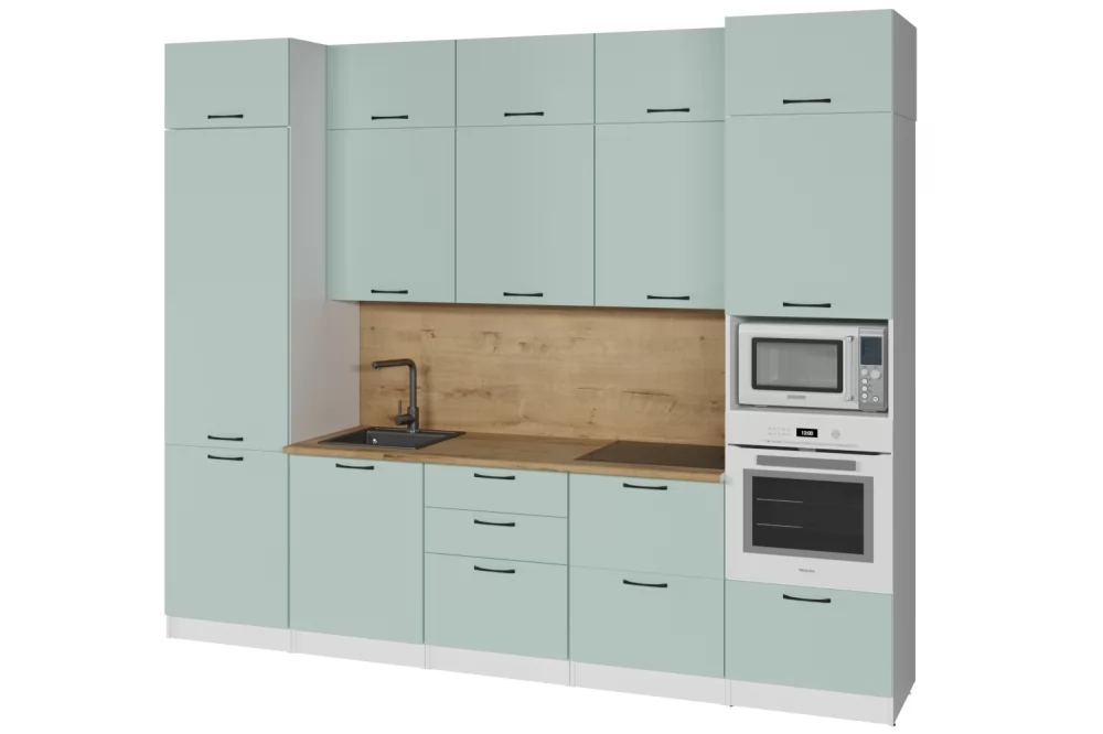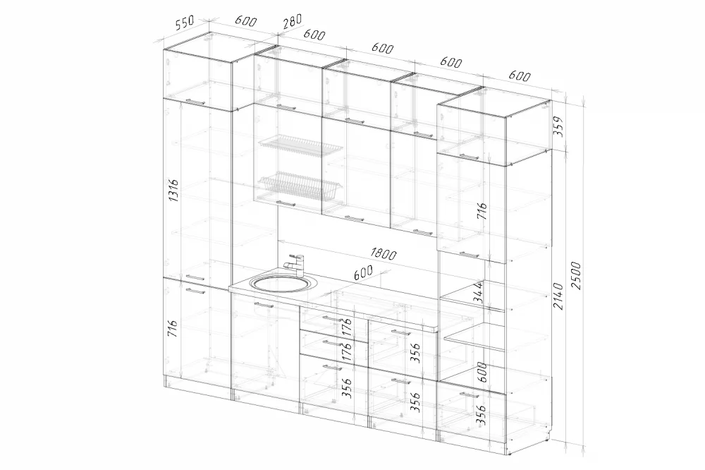 Мойки, смесители, посудосушители, варочные панели, духовые шкафы, плиты, вытяжки в комплекты гарнитуров не входят.