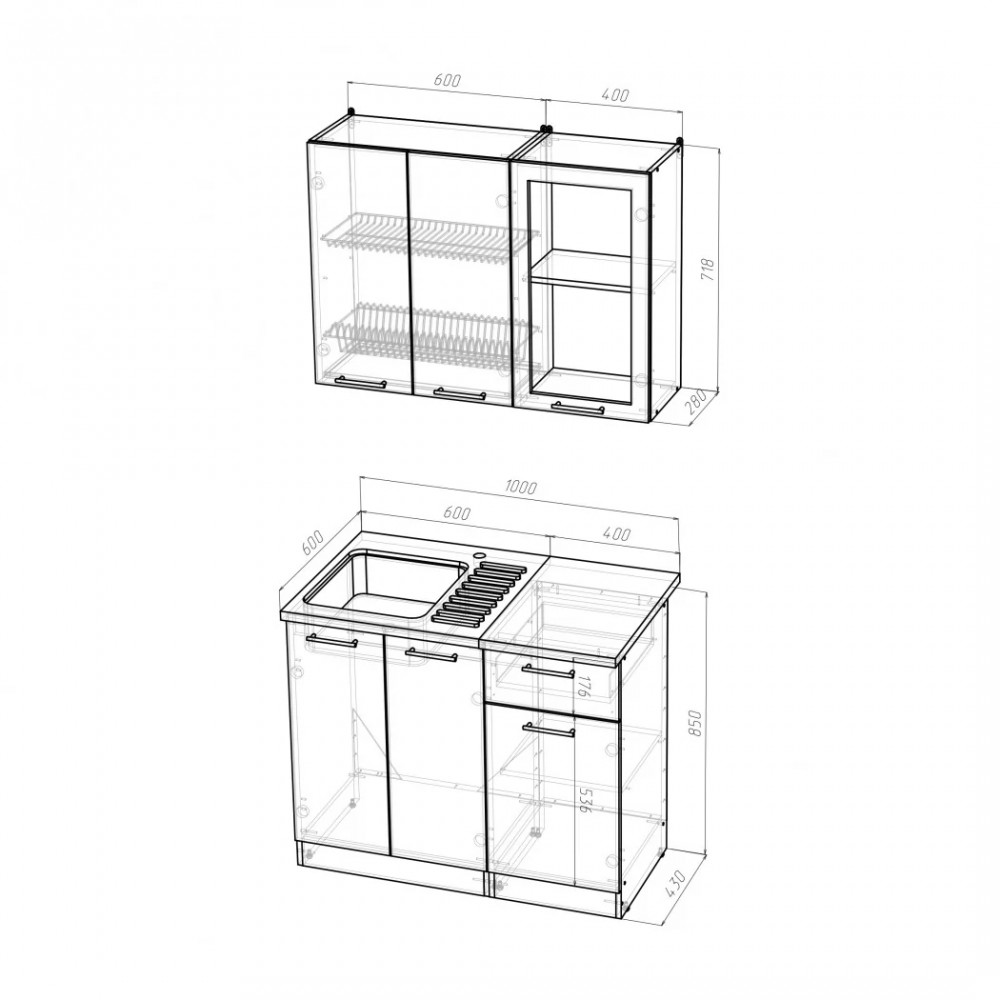 Мойки, смесители и посудосушители в комплекты гарнитуров не входят.
