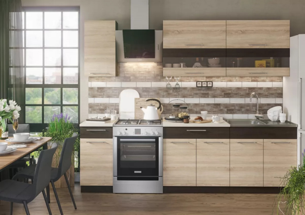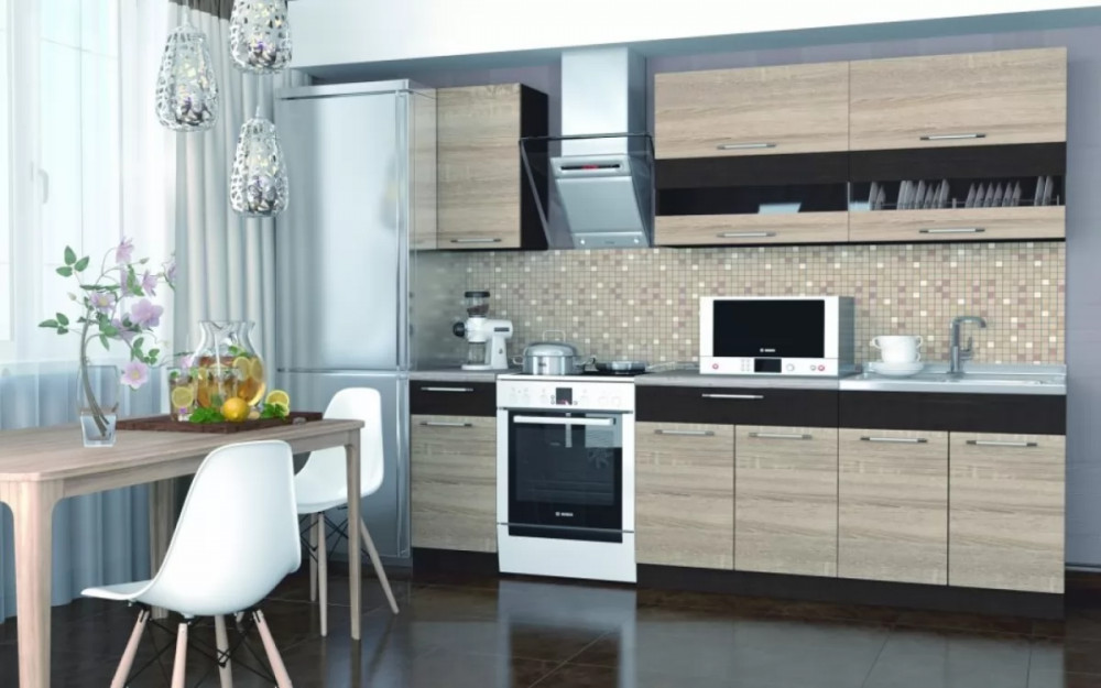 Сушка для посуды приобретается отдельно! Толщина столешницы - 28 мм. Вставки в верхних фасадах - стекло тонированное 4 мм. Корпус нижних шкафов устанавливается на регулируемой опоре (H100) с приставным цоколем на клипсах. Столешница ПФ тростник.
