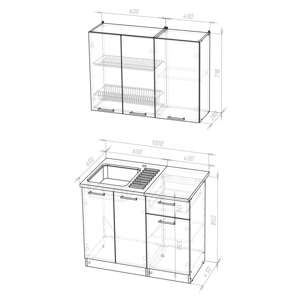 Мойки, смесители и посудосушители в комплекты гарнитуров не входят.