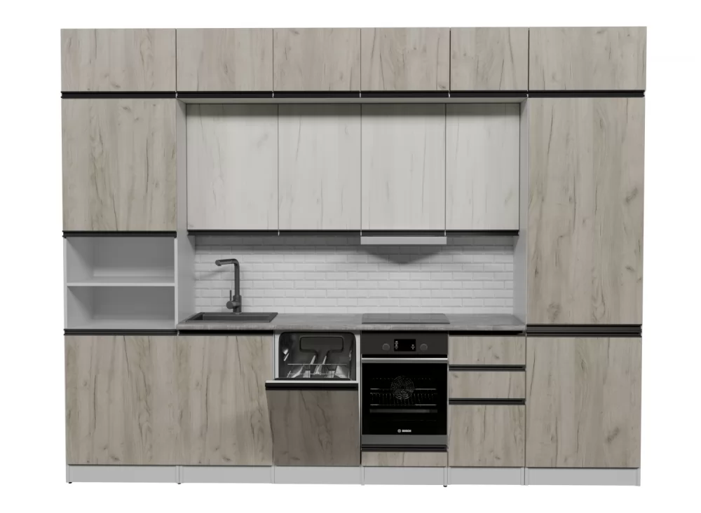 Кухонный гарнитур Паола из ЛДСП в модном цвете "Дуб грей" впишется в современный дизайн интерьера. Подойдет как для частного дома, так и для небольшой квартиры. Напольные и подвесные шкафы позволят разместить всю кухонную утварь. Гарнитур состоит из набора шкафов, которые органично комбинируются между собой. Ящики, полки, навесные шкафы, тумбы и пеналы можно менять местами, создавая практичное рабочее пространство.