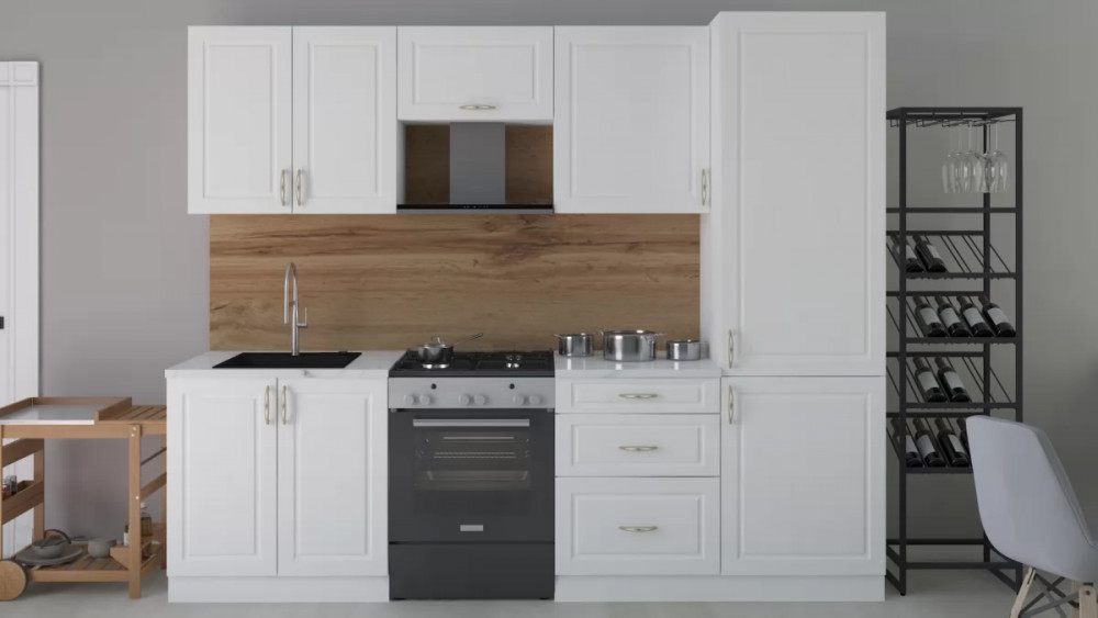 В стоимость не включено: Стеновая панель, столешница, доводчики, цоколь, бытовая техника, мойка, смеситель, аксессуары.