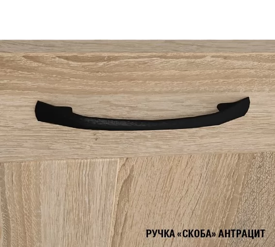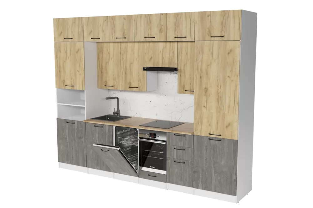 Тумба под врезную мойку (Ш × Г × В): 500 × 600 × 850 мм. Рабочий стол (Ш × Г × В): 400 × 600 × 850 мм. Стол под духовой шкаф (Ш × Г × В): 450 × 600 × 850 мм. Комплект для посудомоечной машины: 450 мм. Навесной шкаф с полками (Ш × Г × В): 500 × 300 × 720 мм. Навесные шкафы (Ш × Г × В): 450 × 300 × 720 мм, 2 шт. Навесной шкаф (Ш × Г × В): 400 × 300 × 720 мм. Мойка, смеситель, посудосушитель и бытовая техника в комплект гарнитура не входят.