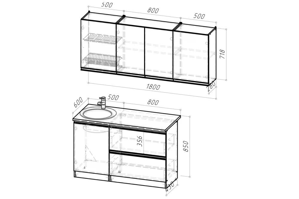Мойки, смесители и посудосушители в комплекты гарнитуров не входят.