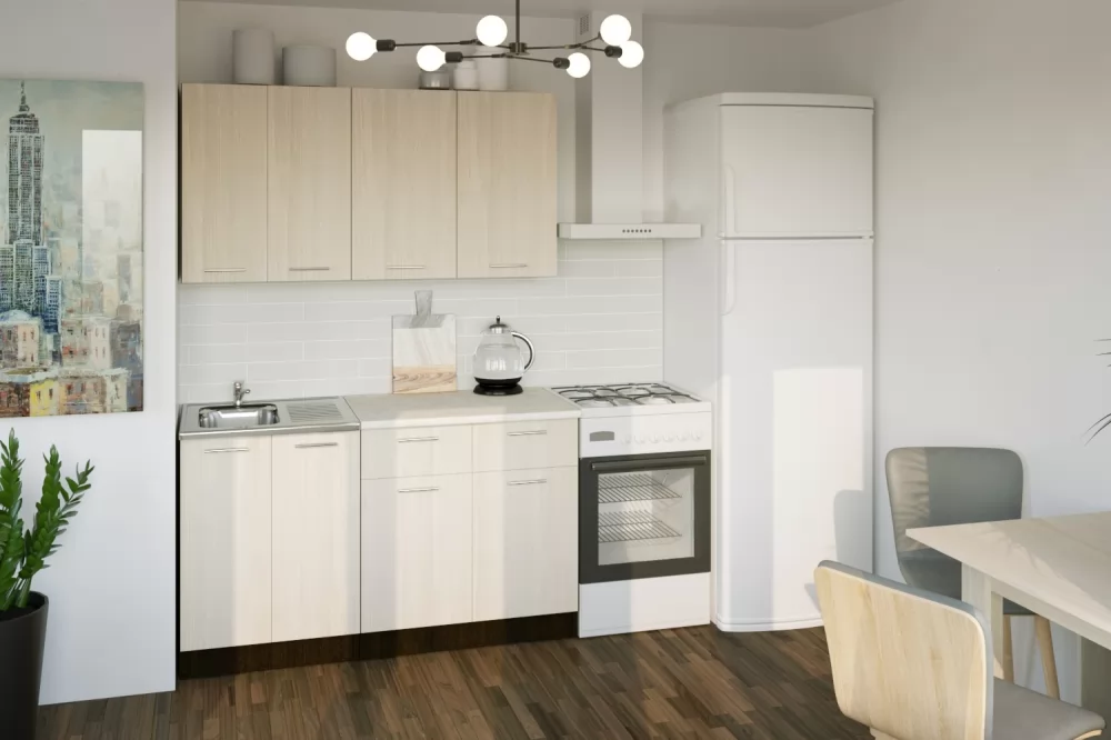 Кухонный гарнитур Светлана медиум из ЛДСП в модном цвете "Ясень шимо светлый" впишется в современный дизайн интерьера. Подойдет как для частного дома, так и для небольшой квартиры. Напольные и подвесные шкафы позволят разместить всю кухонную утварь. Гарнитур состоит из набора шкафов, которые органично комбинируются между собой. Ящики, полки, навесные шкафы, тумбы и пеналы можно менять местами, создавая практичное рабочее пространство