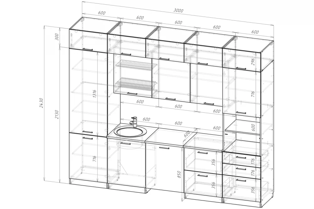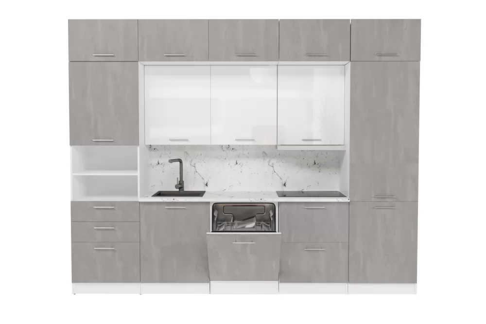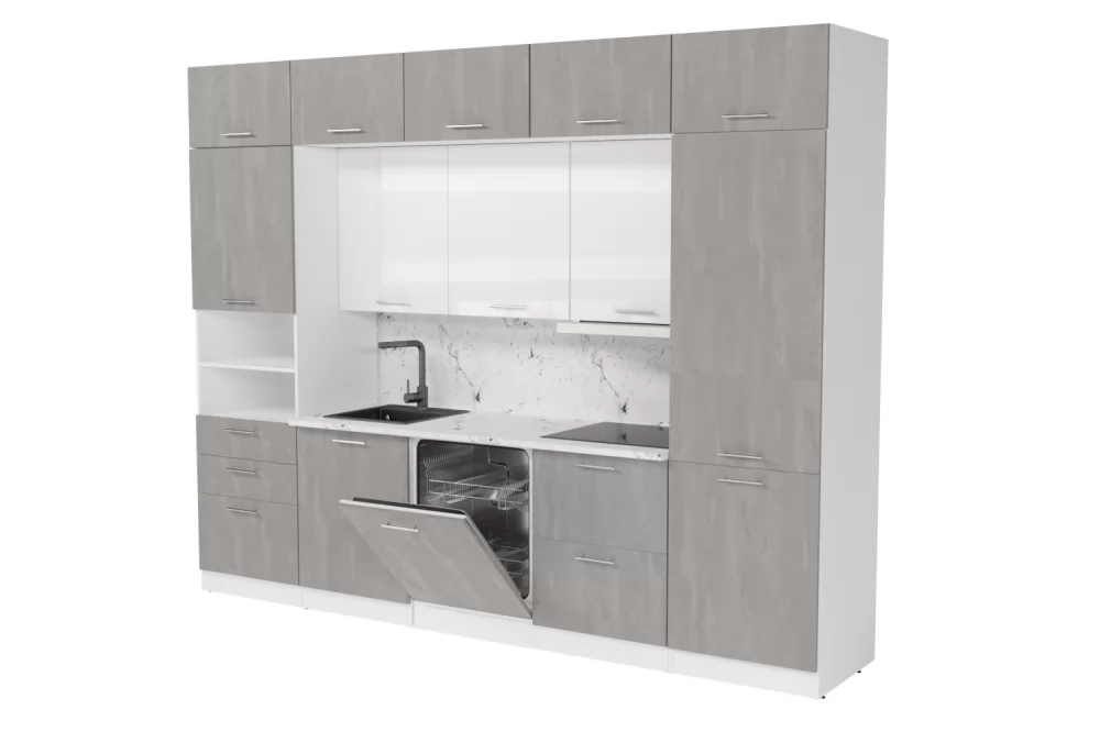 Ширина, мм 3000Глубина, мм 600Высота столов, мм 850Высота шкафов, мм 720Материал ЛДСПЦвет короба БелыйЦвет короба открытых модулей БелыйЦвет верхних фасадов Белый глянецЦвет нижних фасадов Бетон светлыйЦвет столешницы Мрамор марквина белыйРучка РейлингКоличество упаковок, шт. 16Стильные и функциональные готовые кухни - это не только комфорт и уют в доме, но и эстетика. Кухонный гарнитур из ЛДСП в модном цвете впишется в современный дизайн интерьера. Подойдет как для частного дома, так и для квартиры. Напольные и подвесные шкафы позволят разместить всю кухонную утварь. Гарнитур состоит из набора шкафов, которые органично комбинируются между собой. Ящики, полки, навесные шкафы, тумбы и пеналы можно менять местами, создавая практичное рабочее пространство.КомплектацияВ стандартную комплектацию кухонных гарнитуров входит:- подробная инструкция по сборке;- саморезы, конфирматы и прочие метизы необходимые для сборки;- петли накладные с евровинтом;- выдвижные механизмы – метабокс;- ручки;- опоры мебельные.Мойки, смесители и посудосушители в комплекты гарнитуров не входят.