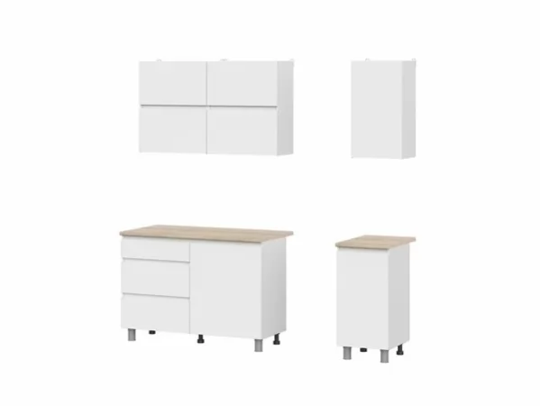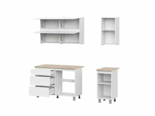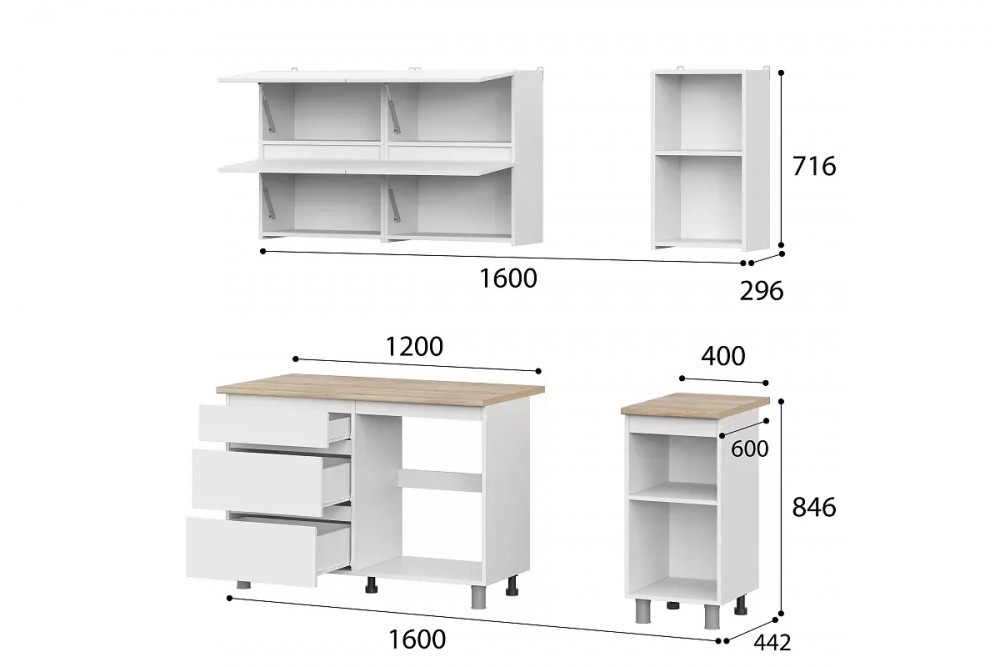 Ширина, мм1600Высота, мм2140Глубина, мм600ЦветБелыйУникальный код товараЦБ-00007843Объем, м³0,223Материал корпусаЛДСПМатериал фасадаЛДСПЦвет корпусаБелый текстурныйЦвет фасадаБелый текстурныйФрезеровкаНетСтильМинимализм, Скандинавский, СовременныйСтолешницаВходит в комплектВес, кг111,1Кухонный гарнитур комплект готовый Токио — готовое решение для создания светлого и визуально легкого интерьера.Дверцы ящиков и шкафов не имеют лицевой фурнитуры, что смотрится современно и упрощает уход за поверхностью.Столешница в оттенке натурального дерева делает гарнитур уютнее, а регулируемые опоры помогают справиться с небольшими неровностями пола.Размеры: Ширина - 1600 мм; Высота - 2140 мм; Глубина - 600 мм.Кухонный гарнитур, состоящий из двух напольных и трех навесных модулей.Напольные модули представляют собой комбинированный стол шириной 1200 мм одна половина которого отсек для хранения с тремя ящиками, вторая половина предназначена для установки мойки и стол с полкой шириной 400 мм.Навесные модули это два шкафа шириной 600мм с 2мя отсеками для хранения с барными створками и шкаф с полкой шириной 400 мм.• Габариты модулей низ (ШхВхГ) - 1600х820х442 мм (без столешницы) / 1200х846х600 (со столешницей).• Габариты модулей верх (ШхВхГ) - 1600х716х296 мм• Глубина столов по корпусу - 426 мм (без фасада).• Габариты ящиков (ШхВхГ) - 552х80х400 мм, 552х150х400 мм• Фасады накладные.• Сборка нижнего корпуса шириной 1200 мм не универсальная (ящики всегда слева). Сборка верхних корпусов и стола шириной 400 мм универсальная.• Максимальная нагрузка на полки - 5 кг, на ящики - 5 кг• Особенности: Фасады шкафов не имеют ручек, вязки верхних шкафов подняты выше края боковин, что дает возможность создать зацеп для открывания створки. Фасады стола имеют скос 45 градусов, для более удобного открывания.Столешница: 1200 х 26 х 600 ммСтолешница: 400 х 26 х 600 ммКухня не имеет цоколя, впереди устанавливаются декоративные опоры.Материал: ЛДСПРоликовые направляющие, петли без доводчиков, газлифт.Цвет корпуса: Белый текстурныйЦвет фасада: Белый текстурныйСтолешница: Дуб Сонома 26 мм