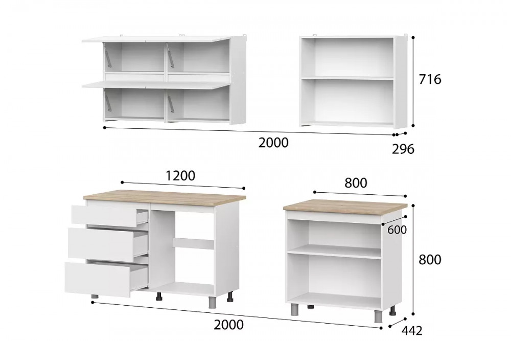 Кухонный гарнитур комплект готовый Токио — готовое решение для создания светлого и визуально легкого интерьера.Дверцы ящиков и шкафов не имеют лицевой фурнитуры, что смотрится современно и упрощает уход за поверхностью.Столешница в оттенке натурального дерева делает гарнитур уютнее, а регулируемые опоры помогают справиться с небольшими неровностями пола.Размеры: Ширина - 2000 мм; Высота - 2140 мм; Глубина - 600 мм.Кухонный гарнитур, состоящий из двух напольных и трех навесных модулей.Напольные модули представляют собой комбинированный стол шириной 1200 мм одна половина которого отсек для хранения с тремя ящиками, вторая половина предназначена для установки мойки и стол с полкой шириной 800 мм.Навесные модули это два шкафа шириной 600 мм с 2мя отсеками для хранения с барными створками и шкаф с полкой шириной 800мм.• Габариты модулей низ (ШхВхГ) - 2000х820х442 мм (без столешницы) / 1200х846х600 (со столешницей).• Габариты модулей верх (ШхВхГ) - 2000х716х296 мм• Глубина столов по корпусу - 426 мм (без фасада)• Габариты ящиков (ШхВхГ) - 552х80х400 мм, 552х150х400 мм• Фасады накладные.• Сборка нижнего корпуса шириной 1200 мм не универсальная (ящики всегда слева). Сборка верхних корпусов и стола шириной 800 мм универсальная.Фасады шкафов не имеют ручек, вязки верхних шкафов подняты выше края боковин, что дает возможность создать зацеп для открывания створки.Фасады стола имеют скос 45 градусов, для более удобного открывания.Столешница: 1200 х 26 х 600 ммСтолешница: 800 х 26 х 600 ммКухня не имеет цоколя, впереди устанавливаются декоративные опоры.Материал: ЛДСПРоликовые направляющие, петли без доводчиков, газлифт.Цвет корпуса: Белый текстурныйЦвет фасада: Белый текстурныйСтолешница: Дуб Сонома 26 ммШирина, мм2000Высота, мм2140Глубина, мм600ЦветБелыйУникальный код товараЦБ-00007844Объем, м³0,259Материал корпусаЛДСПМатериал фасадаЛДСПЦвет корпусаБелый текстурныйЦвет фасадаБелый текстурныйФрезеровкаНетСтильМинимализм, Скандинавский, СовременныйСтолешницаВходит в комплектВес, кг129,4