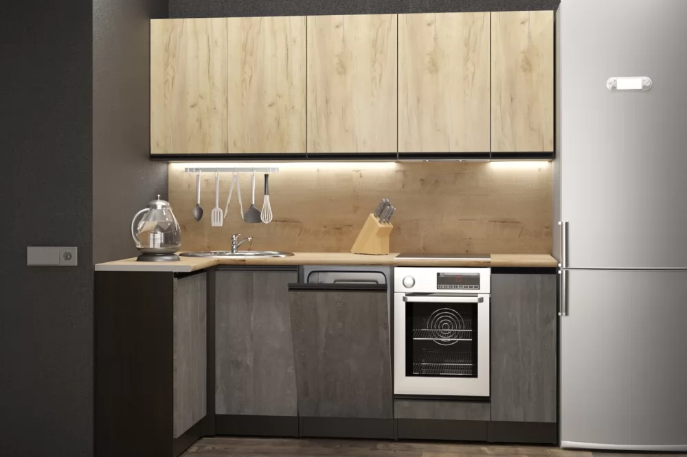 Прямые готовые кухни рациональны для маленьких квартир. Их стоимость ниже угловых на 10-15 процентов, при этом все ящики и шкафы находятся в удобном доступе. При прямой планировке кухни важно предусмотреть место для холодильника и учесть его габариты. Если ваша кухня объединена с гостиной, или же настолько просторная, что позволяет сделать полноценную обеденную зону для большой семьи, то смело выбирайте линейную конфигурацию кухни.