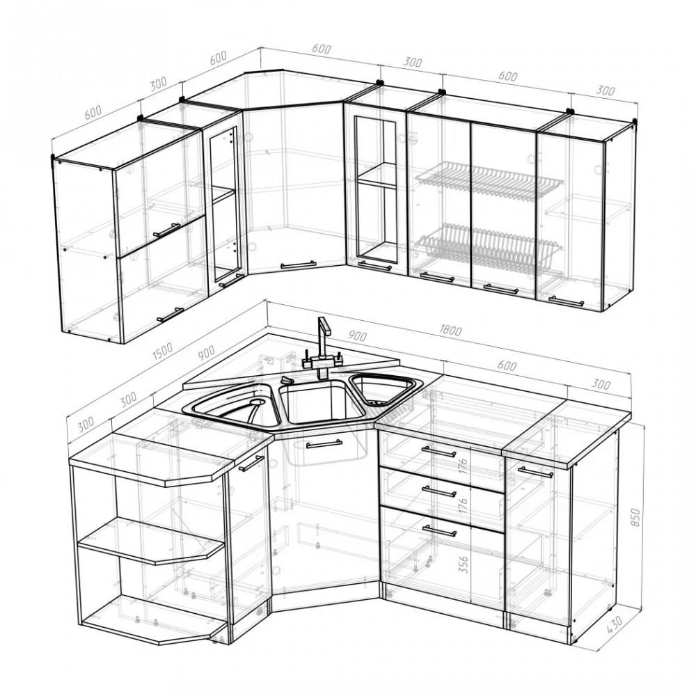 Мойки, смесители и посудосушители в комплекты гарнитуров не входят.