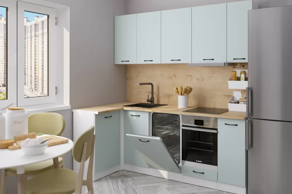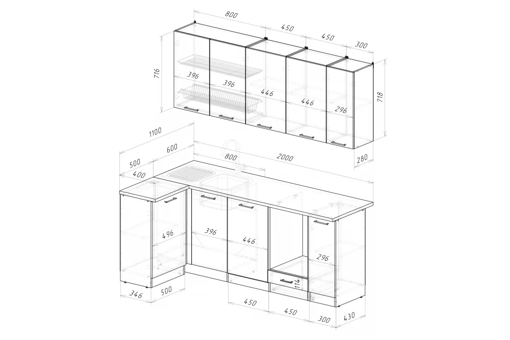 Мойки, смесители, посудосушители, варочные панели, духовые шкафы, плиты, вытяжки в комплекты гарнитуров не входят.